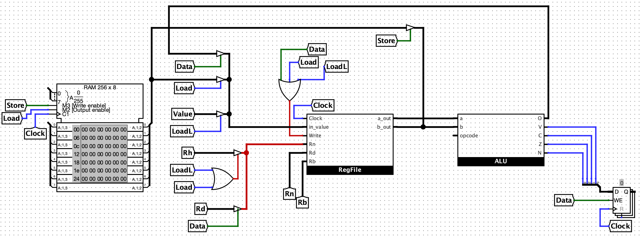 The register file is a small, fast memory inside the CPU. It stores data that the CPU actively uses during computations. In much more complex CPU designs than what I have done there will be many different types of registers (general and special purpose). For my design, I kept it simple and just had 8 registers and a simple PLC to decide which data to return depending on the input fed in.