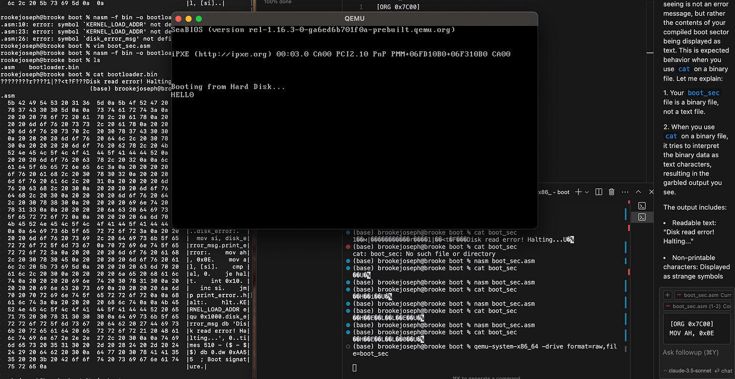 I built my bootloader using QEMU to simulate the software environment needed to run the OS I'm developing, along with NASM to assemble the code. The entire project is written in ARM assembly, which allows me to manage the low-level functionality critical to starting up the system. One of the key milestones I’ve achieved so far is successfully printing text to the screen, signaling that the bootloader has been initialized properly. This output serves as a basic but essential step in verifying that the system is ready for further development.